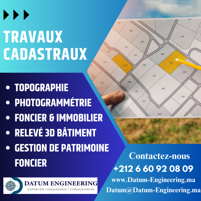 Chez DATUM Engineering, nous mettons à votre disposition notre expertise en matière de topographie et d'administration foncière pour vous accompagner dans toutes vos démarches cadastrales et administratives. Nous comprenons que la gestion des documents fonciers et cadastraux peut être complexe, c’est pourquoi nous vous offrons un service complet, adapté à vos besoins spécifiques.